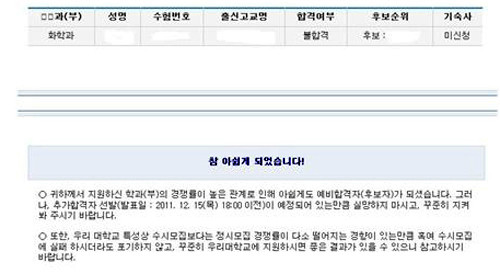 이에 따르면 "참 아쉽게 되었습니다. 학과의 경쟁률이 높은 관계로 아쉽게 예비합격자가 되셨습니다. 추가합격자 선발이 예정되어 있는 만큼 실망하지 마시고, 꾸준히 봐주시기 바랍니다"고 적혀있다.
