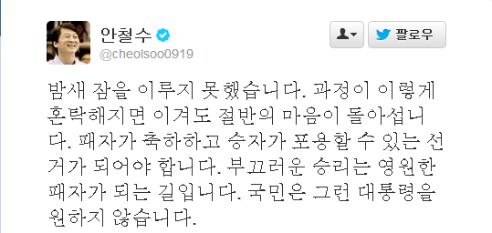 안철수 씨는 지난 3일 캠프 해단식에서도 이날 트위터에 쓴 내용과 비슷한 발언을 한 바 있다.