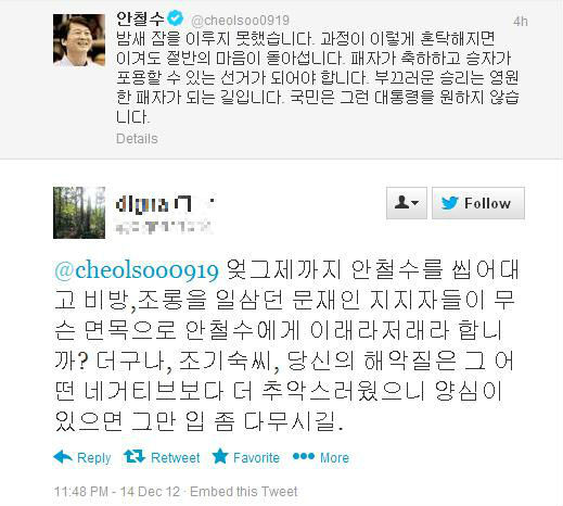 - 트위터 아이디 digna1****문재인 후보 측 일부 지지자들은 안철수 전 후보의 발언을 비난하기도 했다.