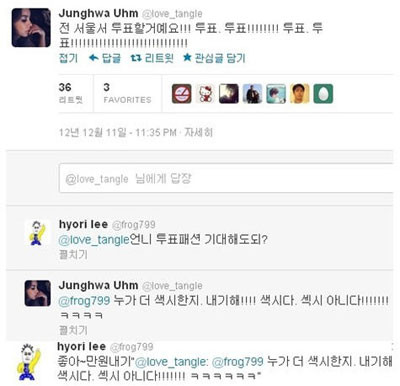 이를 본 이효리는 “언니 투표패션 기대해도 돼?”라고 르트윗하자 엄정화는 바로 “누가 더 색시한지 내기해! 색시다. 섹시 아니다!”라며 장난으로 화답했다. 이에 이효리도 “좋아~만원 내기”라며 제안을 흔쾌히 받아들였다.