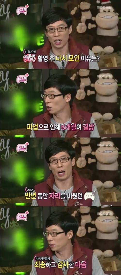 이날 방송에서 유재석은 “파업 때문에 무한도전이 5개월 동안 결방했다. 그로인해 장기 프로젝트를 하지 못했다”며 “시청자 분들에게 죄송한 마음이다”고 사과했다.