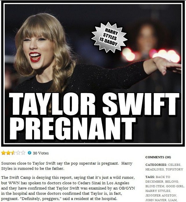 위클리월드뉴스 등 다수의 현지 언론은 "테일러 스위프트가 LA에 위치한 한 산부인과에서 검진을 받고 '임신 사실'을 확인했다"고 전했다. 아이의 아버지는 그룹 원디렉션의 멤버인 해리 스타일(18)로 알려졌다.