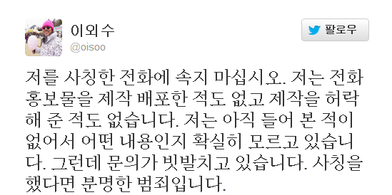 이날 오전 이외수 씨는 자신의 트위터를 통해 "전화 홍보물을 제작 배포한 적도 없고 제작을 허락해 준 적도 없다"며 이같이 밝혔다.