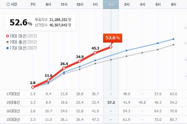 오후 2시 현재 투표율은 52.6%로 17대 대선 보다 더 높은 것으로 나타났다.