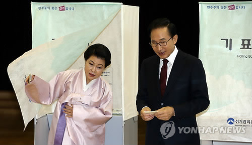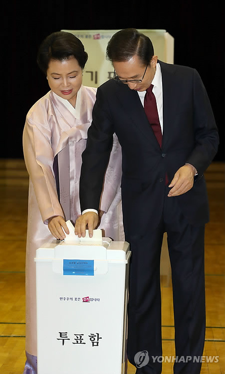 19일 오전 청운효자동 제1투표소에 마련된 투표소에서 이명박 대통령과 부인 김윤옥 여사가 제18대 대통령선거 투표를 하고 있다.