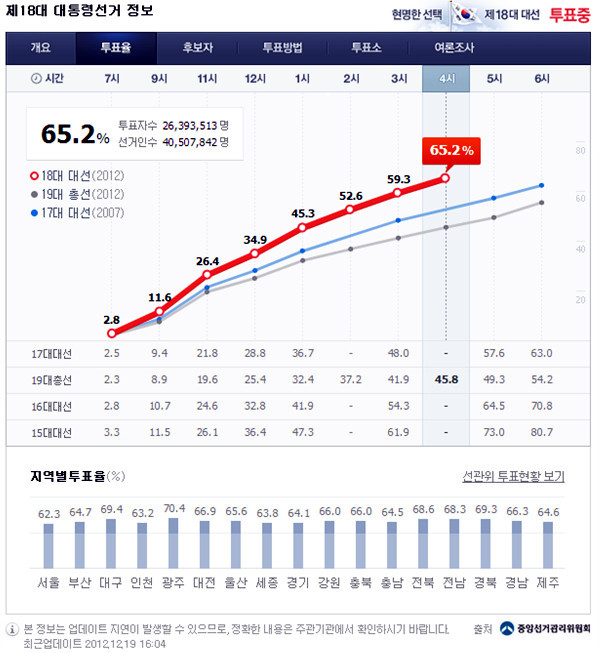제18대 대통령 선거일인 19일 투표율은 오후 4시 4분 현재 기준으로 65.2%인 것으로 나타났다. 중앙선거관리위원회에 따르면 선거인단 40,507,842명 중 현재 26,393,513명이 투표에 참여했다.