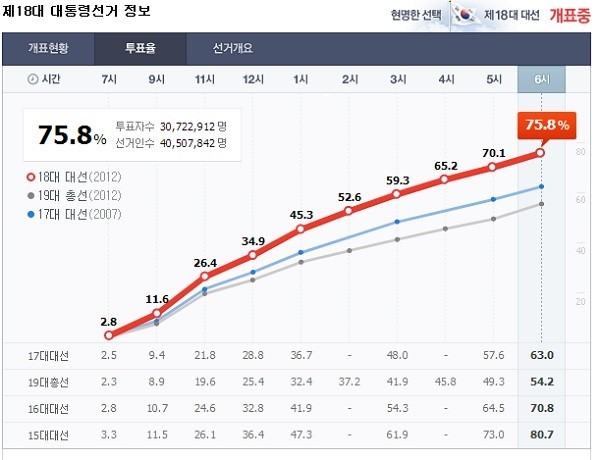 제18대 대통령선거가 전국 투표율 75.8%를 기록하며 마무리 되었다.