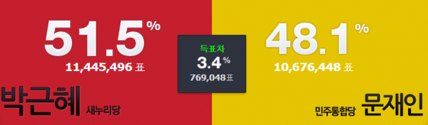 19일 오후 10시 41분 중앙선거관리위원회에 따르면 전국 개표율 72.1%로 진행중이며 박근혜 새누리당 후보가 51.5%, 문재인 민주통합당 후보가 48.1%를 기록, 박 후보가 문 후보를 3.4% 앞서는 것으로 나타났다.