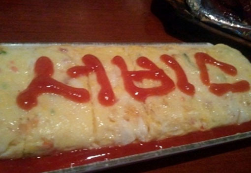 게재된 사진에는 먹음직스러운 계란말이가 담겨 있으며, 알바생은 계란말이 위에 케첩으로 ‘서비스’라는 글씨를 그려 넣는 센스를 발휘했다.