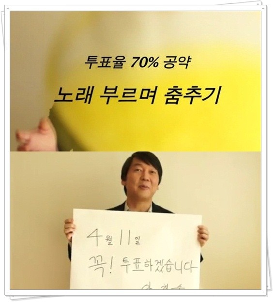 야권을 지지하는 유명 인사들이 "투표율이 몇% 오르면 OO을 하겠다"는 공약을 남발하게 된 것도 이같은 배경에서 비롯됐다.이른바 스타들의 '공약 퍼레이드'는 지난 4·11 총선에서 두드러졌다.