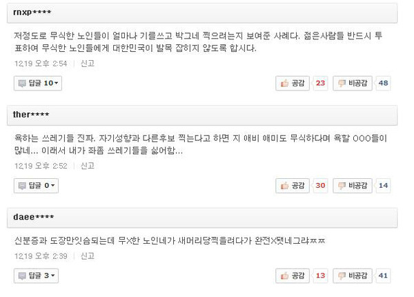 - 네이버 아이디 daee****“저 정도로 무식한 노인들이 얼마나 기를 쓰고 박그네 찍으려는지 보여준 사례다. 젊은 사람들 반드시 투표하여 무식한 노인들에게 대한민국이 발목 잡히지 않도록 합시다.”