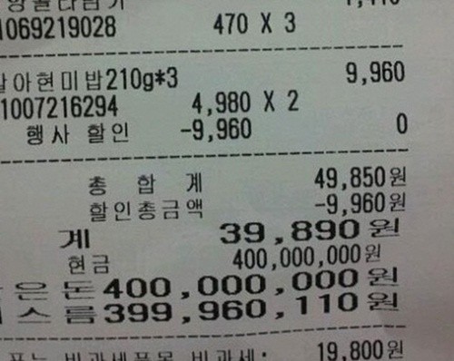 공개된 사진은 한 마트 영수증을 찍은 것으로 산 물건의 금액과 현금을 낸 액수가 보는 이들의 눈을 의심케 한다. 약 4만원 상당의 총액이 나왔는데 무려 4억이라는 현금을 지불해 마트는 거스름돈으로 3억 9천996만을 거슬러준 것.