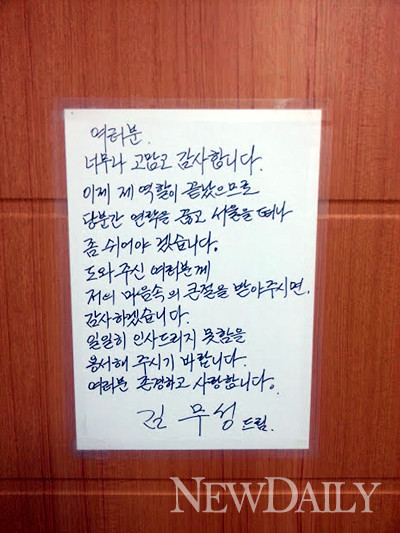 김 전 본부장은 이날 오후 3시쯤 새누리당사 3층에 있는 자신의 사무실 문 앞에 "도와주신 여러분께 제 마음 속 큰 절을 받아주시면 감사하겠다"며 이같이 썼다.