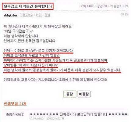 그 설명이 더 가관이다."크락션을 머리로 계속 누르고 있으면 뒷차 운전자에게 주는 공포감이 극대화된다. 그 뒤에 서서히 내리면 사고낸 사람을 처리하기 쉽다."