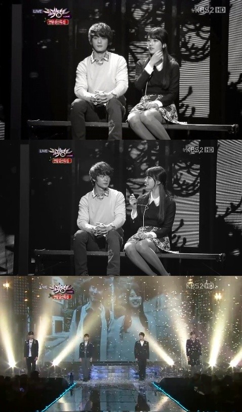 ‘건축학 개론’을 통해 첫사랑의 아이콘으로 등극한 수지는 이날 노래가 시작되기에 앞서 영화의 한 장면을 연출했다. 수지는 귀에 꽂았던 이어폰 한 쪽을 빼내어 민호에게 “들을래?”라고 말한다. 이어 수지가 민호의 귀에 꽂아주자 2AM의 감미로운 무대가 시작됐다.