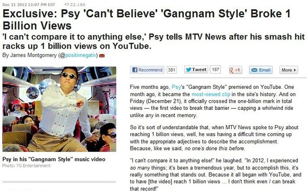 이와 관련, 미국의 빌보드지는 "유튜브에 오른 싸이의 '강남스타일' 뮤직비디오가 사상 처음으로 10억뷰를 넘은 뮤직비디오가 됐다"며 "저스틴 비버의 기록을 넘어선 지 27일 만에 새로운 전인미답의 신기록을 달성했다"고 전했다.