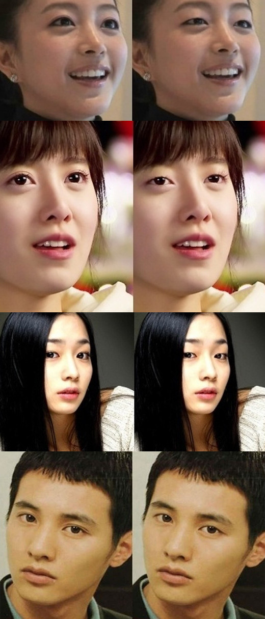 공개된 사진 속에는 배우 구혜선, 한예슬, 이민정, 원빈의 실제 사진과 쌍꺼풀을 이미지 수정 프로그램을 이용해 제거한 모습이 비교돼 있다. 쌍꺼풀만 없앴을 뿐인데 모습이 상당히 달라 화제가 된 것이다.