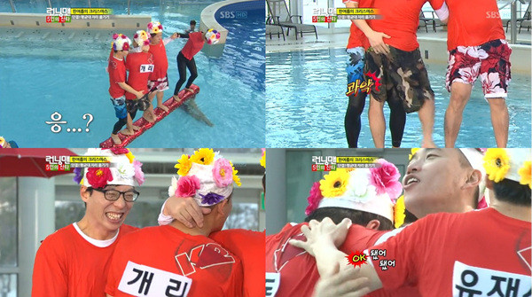 이날 유재석과 개리는 빨간팀(정형돈, 송지효)으로 한 팀을 이뤄 각종 미션을 수행했다. 미션 중 물 속 평균대에서 멤버들의 자리를 바꾸는 게임에서 유재석이 엉큼한 모습을 보여 눈길을 끌었다.