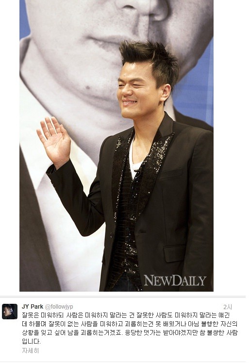 박진영은 24일 자신의 미투데이에 수지의 성희롱 사건에 대해 다음과 같이 심경을 전했다."잘못은 미워하되 사람은 미워하지 말라는 건 잘못한 사람도 미워하지 말라는 얘기인데, 하물며 잘못이 없는 사람을 미워하고 괴롭히는 건 못 배웠거나 아님 불행한 자신의 상황을 잊고 싶어 남을 괴롭히는거겠죠. 응당한 대가는 받아야겠지만 참 불쌍한 사람입니다"