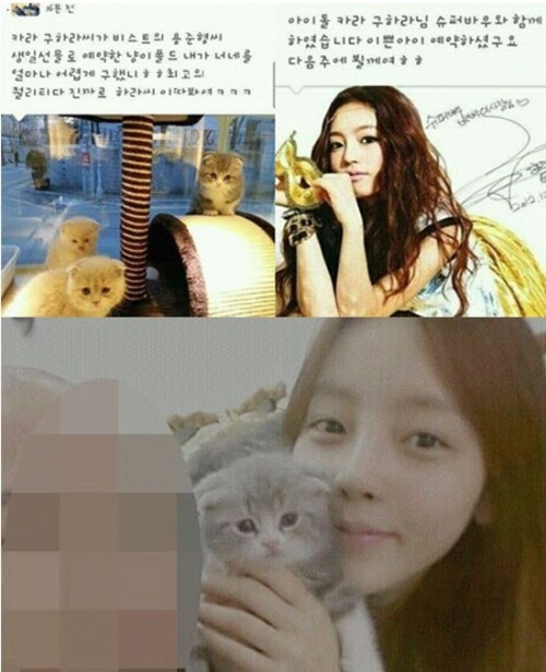 공개된 게시물에는 애완동물 숍을 운영하는 주인의 SNS를 캡쳐한 사진이 담겨있다. 사진에는 "카라 구하라씨가 비스트 용준형씨 생일 선물로 예약한 스코티쉬 폴드. 내가 너희를 얼마나 어렵게 구했니. 최고의 퀄리티다 진짜로. 하라씨 이따 봐요"라는 글과 함께 아기 고양이들의 사진이 담겨있다.