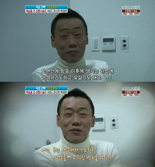 27일 방송된 KBS 2TV '여유만만'에 출연한 백재현은 뮤지컬 실패로 자살 직전까지 내몰렸다가 혹독한 다이어트를 거쳐 새롭게 거듭난 자신의 라이프 스토리를 공개했다.