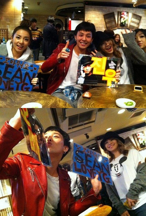 걸그룹 2NE1의 산다라박 씨엘, 공민지와 빅뱅 지드래곤이 한 식당에 나란히 앉아 다정한 포즈와 함께 즐거운 표정을 짓고 있다. 이들은 '진우', '고마워요 션'이라고 적힌 플랜카드를 들고 있으며, 마치 지누션의 열혈팬 같은 느낌이다.