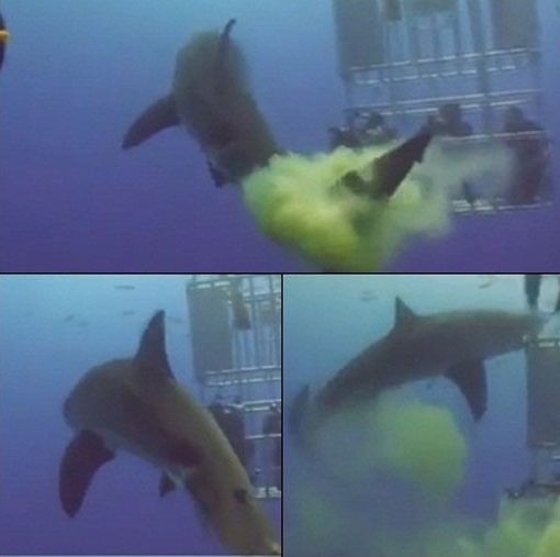 공개된 영상에서 다이버들은 안전장치 안에 들어가 바다를 헤엄치는 상어의 모습을 촬영하고 있다. 이때 상어는 자신을 촬영하는 다이버 쪽으로 서서히 접근하더니 노란 액체를 몸 밖으로 배출해 바다를 오염시킨다.