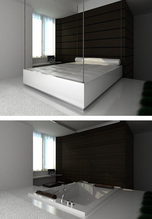 해당 침대는 이탈리아의 한 가구 회사가 디자인한 것으로 평상시에는 잠을 잘 수 있는 공간으로 활용되지만, 침대를 위로 올리면 아래에 배치된 욕조가 드러나 욕실로도 사용할 수 있다. 이 같은 독특한 구조 때문에 ‘욕실로 변하는 침실’이라고 부르고 있는 것.