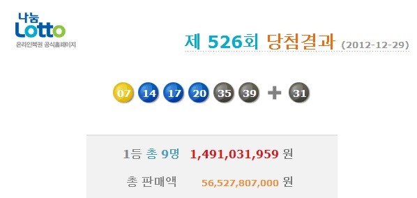 2012년 12월 29일 실시된 제526회 나눔로또 1등 당첨번호는 '7, 14, 17, 20, 35, 39'번이며, 2등 보너스 번호는 31번이다.