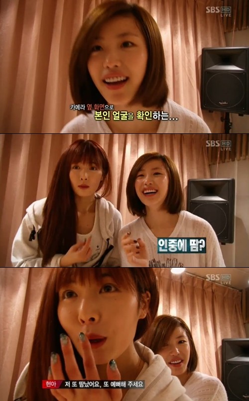 특히, 안무 연습에 한창이던 현아와 전효성은 카메라를 앞에 두고 민낯을 그대로 드러내 눈길을 끌었다. 현아는 "나 인중에 땀이 나서 제일 웃기다"며 "음악중심 마지막 방송 때 예쁘게 나왔다고 좋아했는데 팬들이 인중에 땀난 모습을 캡처해 너무 귀엽다고 하더라"라고 밝혀 웃음을 자아냈다.