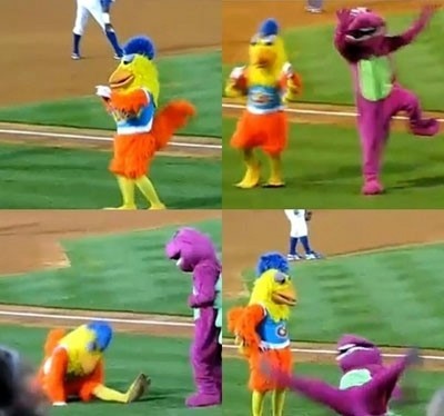 게시물은 경쟁 붙은 알바 유튜브 영상을 캡처한 것이다. 영상 속에는 야구장에서 인형탈을 쓰고 퍼포먼스를 하는 알바생들의 모습이 담겨 있다. 닭 인형 탈을 쓴 알바생과 공룡 탈을 쓴 알바생이 춤 대결을 펼친다.