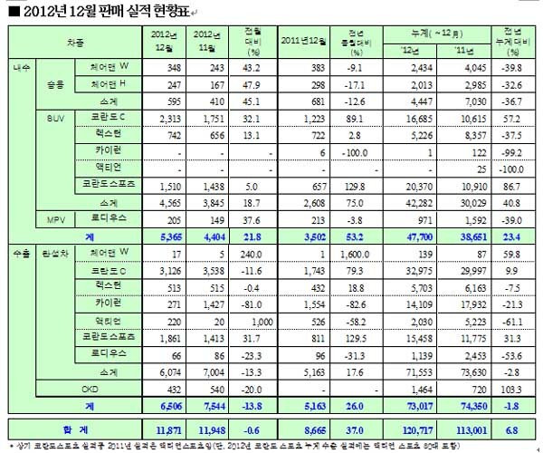 수출도 2011년 12월에 비해 26% 증가했다.쌍용차는 2012년 내수판매량이 2011년에 비해 23.4% 증가한 점에 기뻐하고 있다.