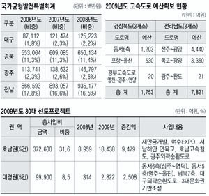 특히 이명박 정권 출범이후 2009년 30대 선도사업 프로젝트 관련 예산비중을 살펴보면 호남권(광주전남북)은 총 5권의 사업에 2008년에 비해 9,479억원이 증가한 1조 8,438억원인 반면 부산·경남권을 제외한 대구경북권의 경우 전년도 314억원에 비해 2,508억원이 증가한 2,822억원에 불과한 것으로 드러났다.