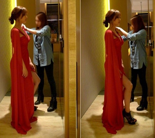 공개된 사진에는 박은지가 드레스룸에서 스타일리스트와 함께 의상을 체크하는 모습이 담겨 있다. 특히, 그녀는 앞트임이 있는 드레스를 입고 한쪽 다리를 내밀고 있는 포즈를 취했다. 이는 자신의 옷매무새를 만져주는 스타일리스트를 위해 다리를 살짝 굽히는 '매너다리'인 것. 하지만 오히려 박은지의 섹시한 몸매와 함께 아찔한 각선미가 그대로 드러났다.