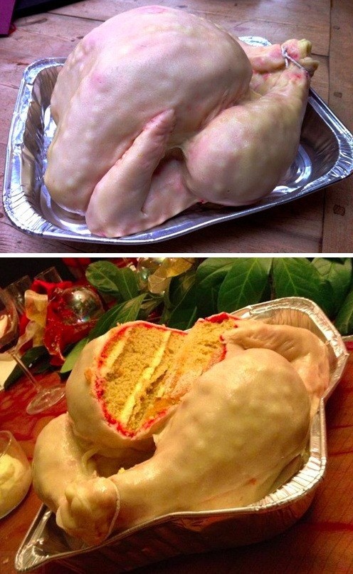 케이크 표면에는 털 자국과 핏자국이 보일 정도로 디테일하게 묘사했으며, 칼로 케이크를 자르는 순간 그 안에는 부드러운 빵과 크림이 가득 채워져 있다. 이 ‘생통닭 케이크’는 영국 유명 요리사의 작품인 것으로 알려졌다.