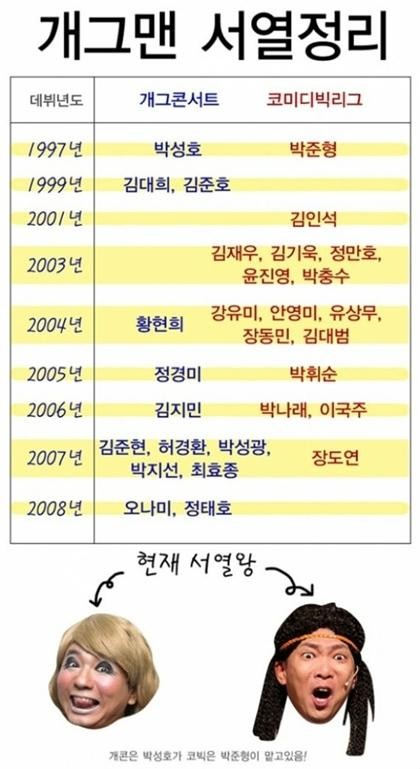 공개된 사진은 KBS '개그콘서트'와 tvN '코미디 빅리그'에서 활약하고 있는 개그맨들의 데뷔 연도를 기준으로 서열을 정리한 표다.