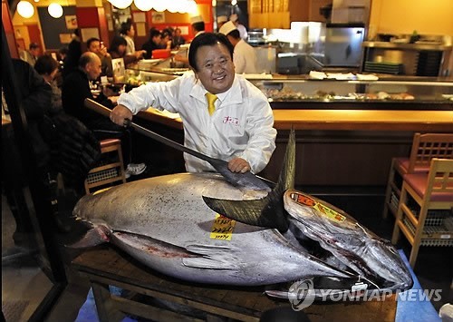 일본에서 참치 한 마리가 무려 18억7천4백만원에 팔렸다.전 세계 참치 경매 사상 최고 금액이다.5일 교도통신과 NHK 방송 등 일본 언론에 따르면 이날 새벽 일본 최대의 수산물시장인 도쿄 쓰키지(築地) 어시장 경매에서 참다랑어(참치) 한 마리가 1억5천540만엔(약 18억7천400만원)에 거래됐다.아오모리(靑森)현 오마(大間)에서 잡힌 이 참치는 222㎏에 달한다.낙찰자는 쓰키지시장에 본점을 둔 초밥(스시) 체인점 '스시잠마이' 운영사인 기요무라(喜代村)사.작년에 기록한 역대 참치 경매 사상 최고액(5천640만엔)의 3배에 달하는 금액을 내고 '참치 한마리'를 산 셈이다.