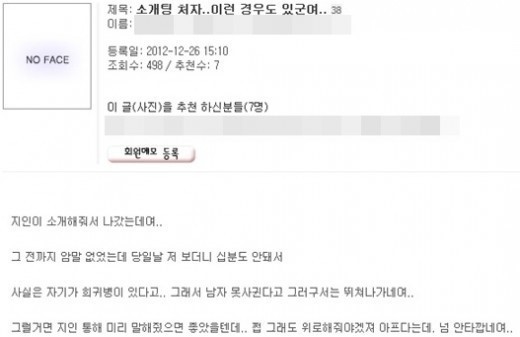 아마도 남성이 너무 마음에 들지 않았던 여성이 참지 못하고 말도 안되는 거짓말을 한 것으로 보인다.하지만 이 남성은 순수했다."그럴거면 지인을 통해 미리 말해줬으면 좋았을텐데. 쩝.""그래도 위로해줘야겠죠. 아프다는데, 너무 안타깝네요."소개팅 여성의 말을 그대로 믿었던 것.평범한 소개팅 후기를 본 네티즌들은 "남자가 맘에 안 들어서 희귀병이 있다고 둘러댔네", "남자 너무 순진하다", "불쌍해서 어쩌지?", "남자분 힘내세요"라고 위로했다.