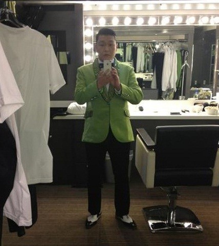 공개된 사진 속 싸이는 분장실로 보이는 곳에서 연한 초록색 턱시도에 검정색 바지를 입고 거울에 비친 자신의 모습을 찍고 있다. 특히, 싸이는 바쁜 일정 때문인지 한 눈에 봐도 볼살이 쏙 빠져 몰라보게 홀쭉해진 모습이다.