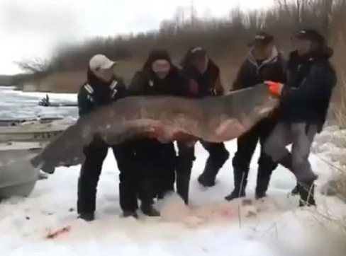 해당 영상 속에는 눈으로 뒤덮인 강둑에서 건장한 남성 다섯 명이 힘겹게 거대한 메기를 들어 올리고 있다.