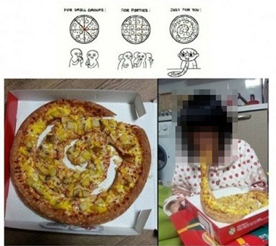 공개된 게시물에는 피자 한판을 달팽이 모양으로 잘라 피자를 입에 물고 있는 여학생의 모습이 담겨있다. 일반적인 8조각 컷팅이 아닌 달팽이 모양으로 잘라져 있어 눈길을 끈다.사진을 접한 네티즌들은 "정말 기발한데.. 좀..." "저걸 따라하다니" "먹는게 더 신기해" "체할 듯" "혼자 저걸 어떻게 먹어" "가능하구나" "빵터졌다"라는 댓글을 달며 관심을 보이고 있다.