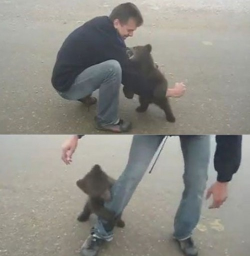 영상에는 성인 남성과 아담한 새끼곰 한 마리가 등장하는데 새끼곰은 남자 때문에 몹시 화가 났는지 그의 팔을 물려고 하고 있다. 그래도 분이 안 풀렸는지 이번에는 남자의 다리를 물려고 달려든다.