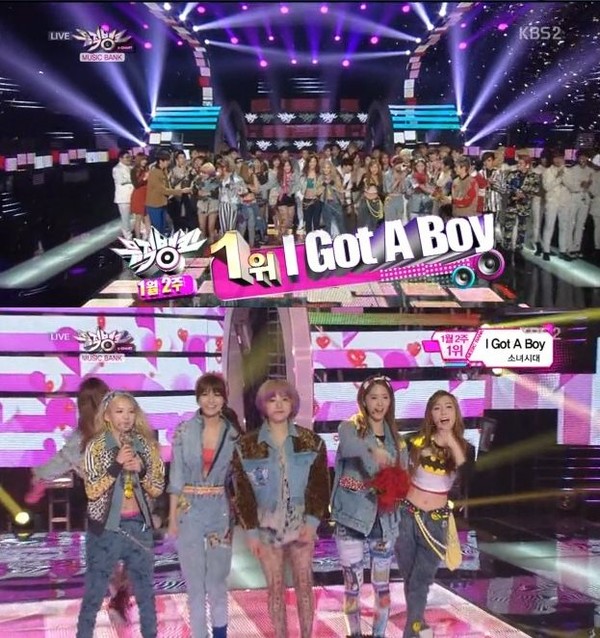 전날 케이블채널 Mnet '엠 카운트다운'에서 'I Got a Boy(아이 갓 어 보이)'로 1위를 차지한 소녀시대는 11일 오후 KBS 신관 공개홀에서 진행된 생방송 '뮤직뱅크'에서도 1위에 랭크돼 여전히 식지 않은 인기를 과시했다.
