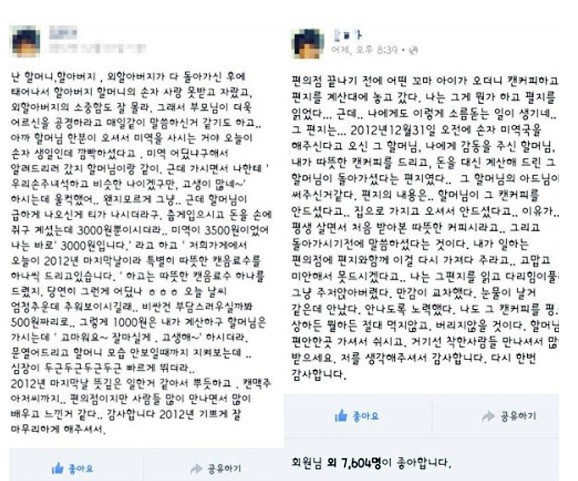 해당 ‘감동적인 편의점 캔커피’ 사연은 다음과 같다. 편의점 아르바이트생이 지난해 12월 31일 손자에게 미역국을 끓여주기 위해 편의점을 찾은 한 할머니에게 캔커피를 선물하고 대신 계산했다. 며칠 뒤 한 꼬마가 캔커피와 편지를 편의점 계산대에 놓고 갔다. 편지에는 그 할머니가 돌아가시기 전 ‘평생 살면서 처음 받아본 따뜻한 커피’라고 감사의 인사가 적혀 있어 보는 이들의 눈물샘을 자극했다.