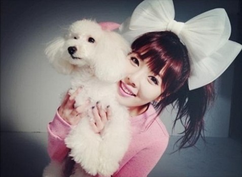 해당 사진에는 현아가 강아지와 함께 깜찍한 모습을 하고 카메라를 응시하는 모습이 담겨 있다.