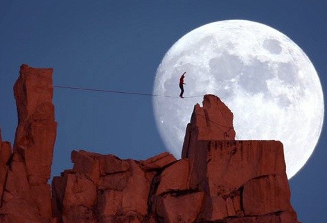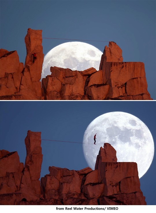 딘 포터는 맨몸으로 절벽을 기어오른 후 절벽 사이에 설치된 밧줄 위를 천천히 걷는다.아무런 안전장비도 없이 보름달을 배경으로 목숨을 걸고 밧줄 위를 걸은 것이다.