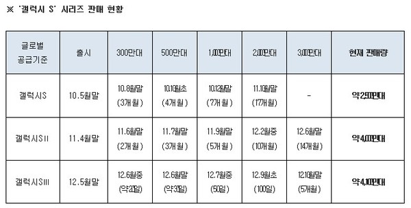 지난해 5월 출시한 ‘갤럭시S3’는 출시 50일 만에 텐밀리언셀러에 이름을 올린데 이어 5개월 만에 3,000만대, 7개월 만에 4,000만대를 넘어섰다.