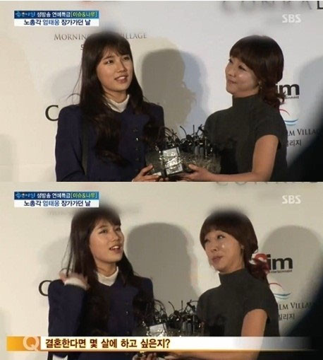 이어 “언제쯤 결혼하고 싶으냐”라는 리포터의 질문에 수지는 “결혼할 나이는 생각 안 해봤다. 정말로 사랑하는 사람이 생겼을 때 신중하게 생각해서 결혼하고 싶다”고 답했다.
