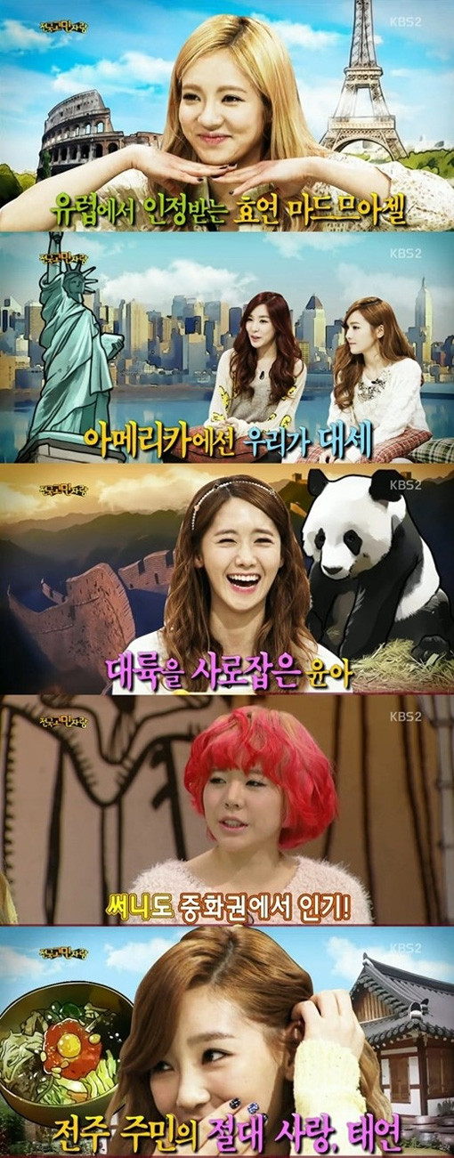 티파니는 “효연이는 유럽에서 인기가 많다. 나와 제시카는 아무래도 영어 때문에 미국에서 인기가 있다”고 밝혔다. 이어 윤아는 “나는 아무래도 중화권에서 인기가 좀 있는 것 같다”고 말했고, 써니는 “대만, 중국에서 좋아해주신다”고 덧붙였다.