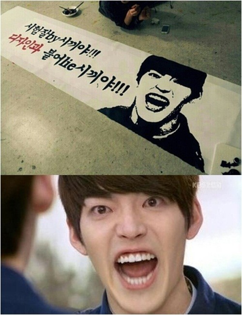 공개된 사진에는 KBS 2TV 월화드라마 '학교 2013'에서 박흥수 역을 맡고 있는 김우빈이 고함을 지르는 모습이다. 이는 극중 고남순 역의 이종석에게 화를 내는 장면을 캡처한 것. 또, '시험 잘 by 시끼야. 디자인과 붙어 lie 시끼야'란 재치 넘치는 글로 박흥수 특유의 말투를 그대로 표현해 보는 이들의 웃음을 자아낸다.